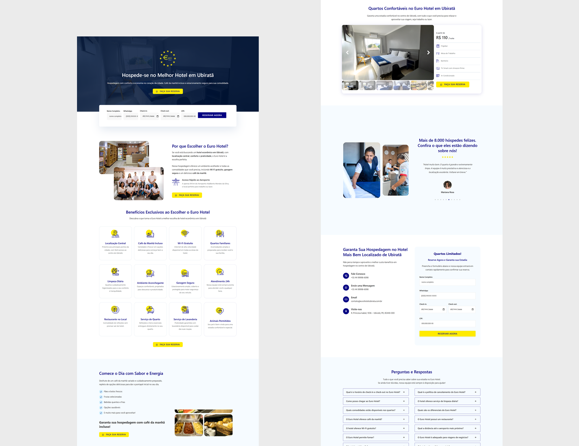 Criamos uma landing page moderna e otimizada para o Euro Hotel, com foco em usabilidade e experiência do usuário. A página foi planejada para destacar os principais serviços do hotel, como tipos de quartos, diferenciais e a localização estratégica, proporcionando aos visitantes informações claras e atrativas. Além disso, desenvolvemos recursos adicionais que ampliam a funcionalidade e a performance da página.
